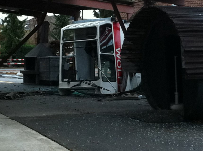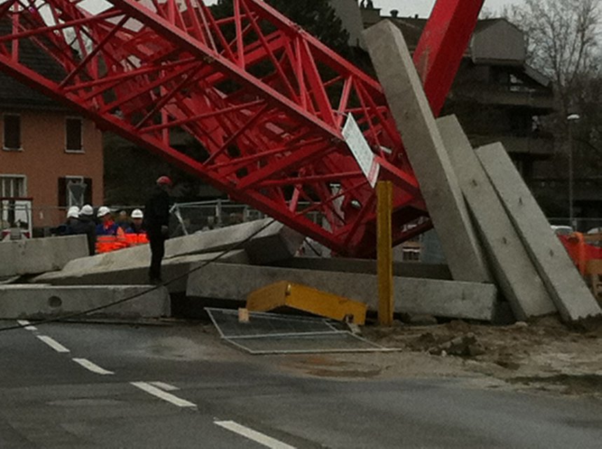 Studen, Switzerland. A 45 Meter Tall Wolff Tower Crane on a cross base fell injuring two people on the ground and the operator of the crane. Also a building that was occupied has been virtually demolished and surprisingly no one was reported as injured. Two cars were struck by the jib of the crane and were certainly a total loss. They were virtually pancaked.