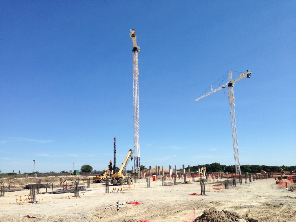 Dallas-based real estate firm KDC and contractor Austin Commercial have erected two high-rise building cranes on the site at Plano Road and State Highway 190. The cranes are visible from nearby North Central Expressway.