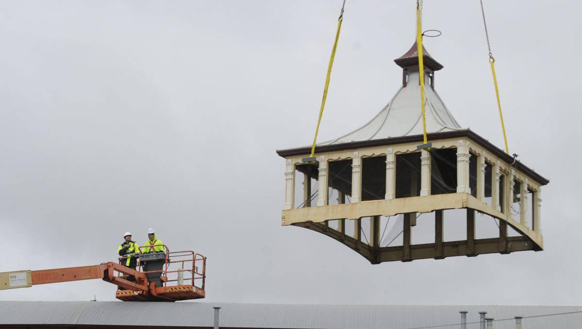 Project manager Leigh Ditchfield said the turrets were in need of refurbishment and the work had to be completed at ground level.He said much careful planning had gone into the removal of the 1.2 tonne structures from the top of the 1878 grandstand.
