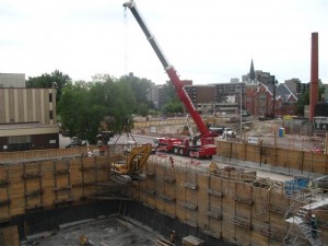 14. Stampede crane lifting a cat excavator out of a new building excavation . The cat weighed 87,000 lbs