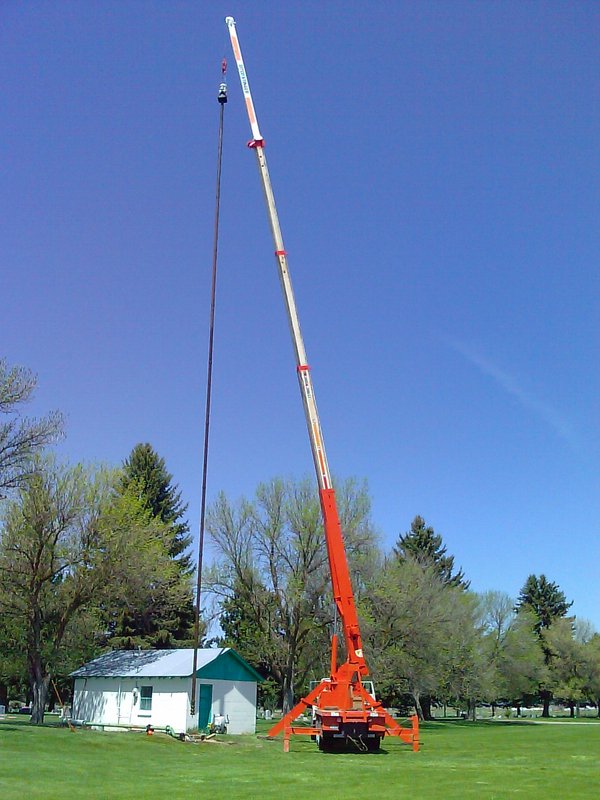 15. Crane pulling out a complete deep well turbine pump in one piece. It is from a local cemetery and is about 110′ deep