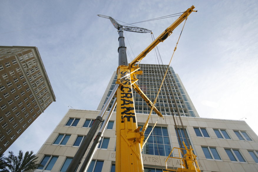 The Grove GMK6550 fully erected with luffing jib ready to lift air handlers onto the Federal Courthouse in Downtown Tampa, FL