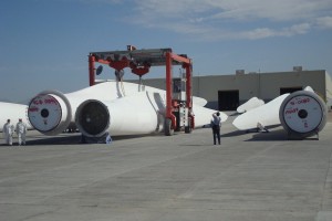 Shuttlelift ISL 30B 30-ton mobile gantry crane is lifting wind blades that are 9.42 ft (2.87 m) at their widest point and 147.64 feet (45 m) long