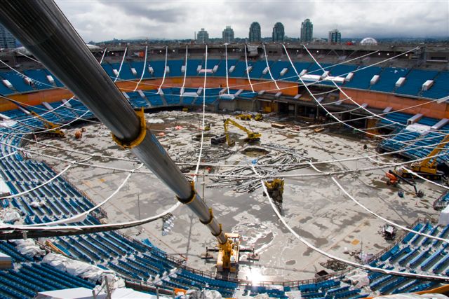 6. Pacific Blasting & Demolition removing the roof at BC Place, Vancouver, cranes lowering the roof fabric from the upper bowl and controlling the cables after cutting from the stadium rim