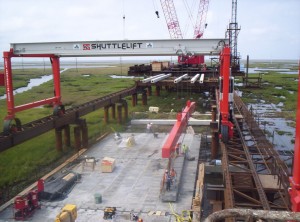 17. Two Shuttlelift ISL series mobile gantry cranes operate on rails to complete the reconstructing LA 1 highway project so to not disturb the delicate ecological system of the marshes and bayous of Louisiana