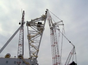 19. Two LR1300 crawlers, one with superlift that ‘walked the load into place while raising the structure, the blackleg is being held by a Liebherr LR1200 and the man basket is being used on the Liebherr LTM 1095 in Alberta