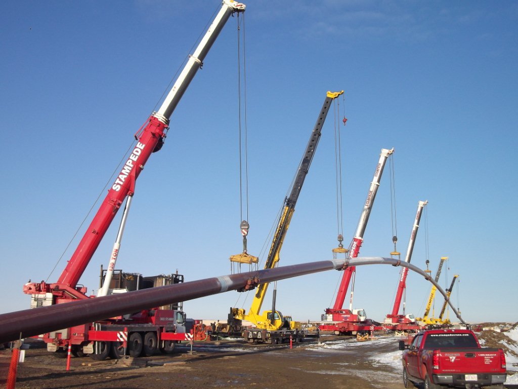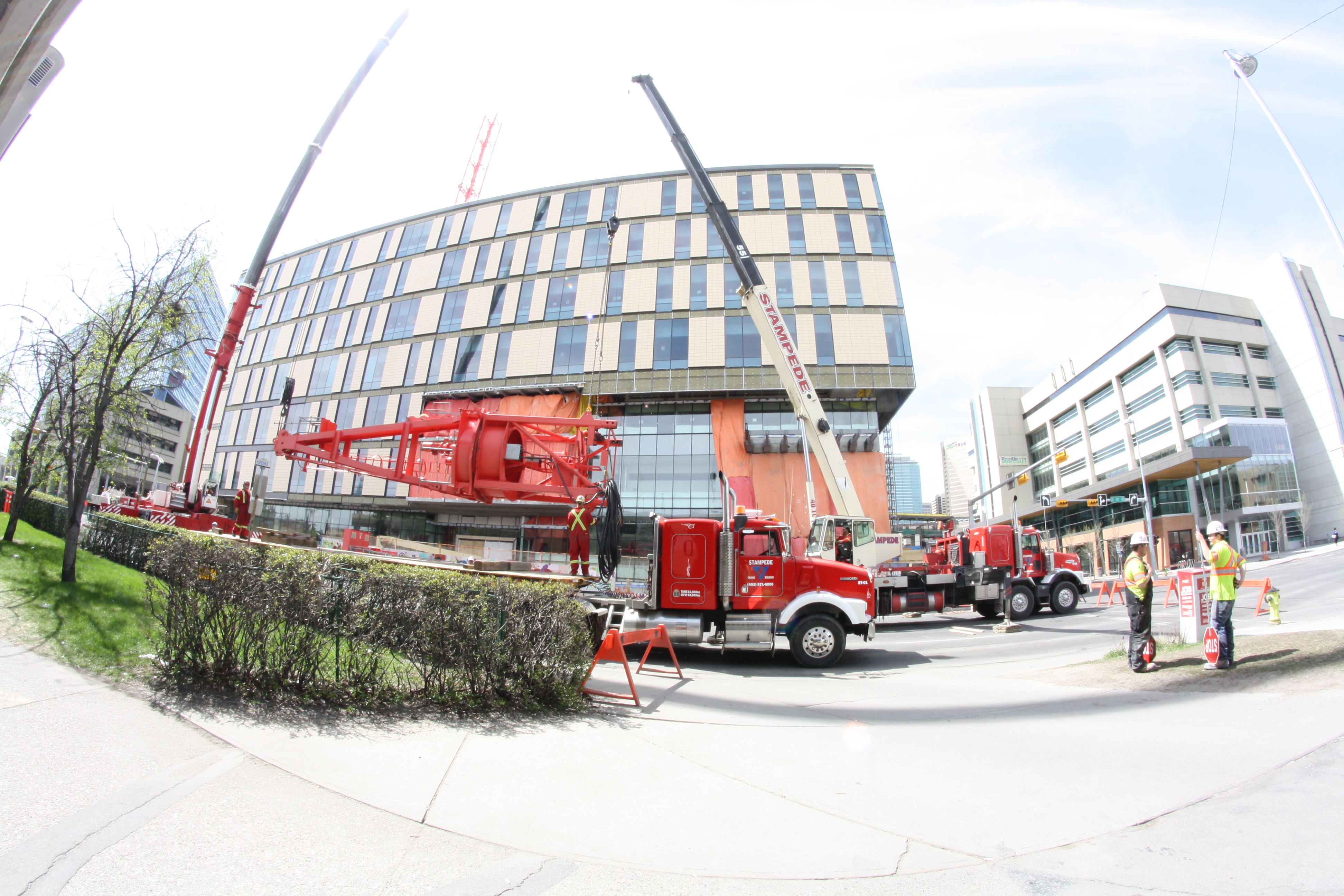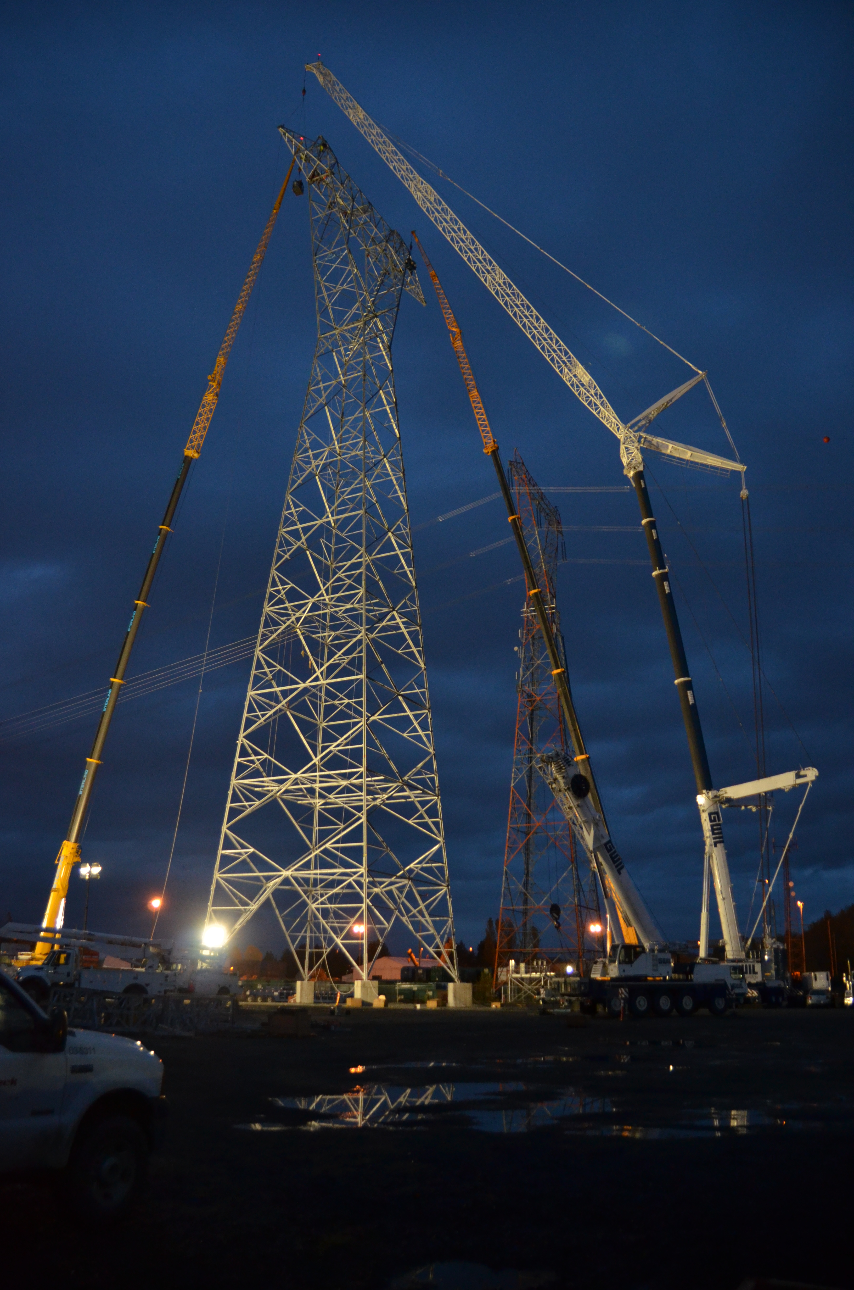 23) Two cranes being used to install/remove the towers and a third crane being used to support and transfer the energized 138,000-volt transmission line at a tower replacement project in Calgary, Alberta