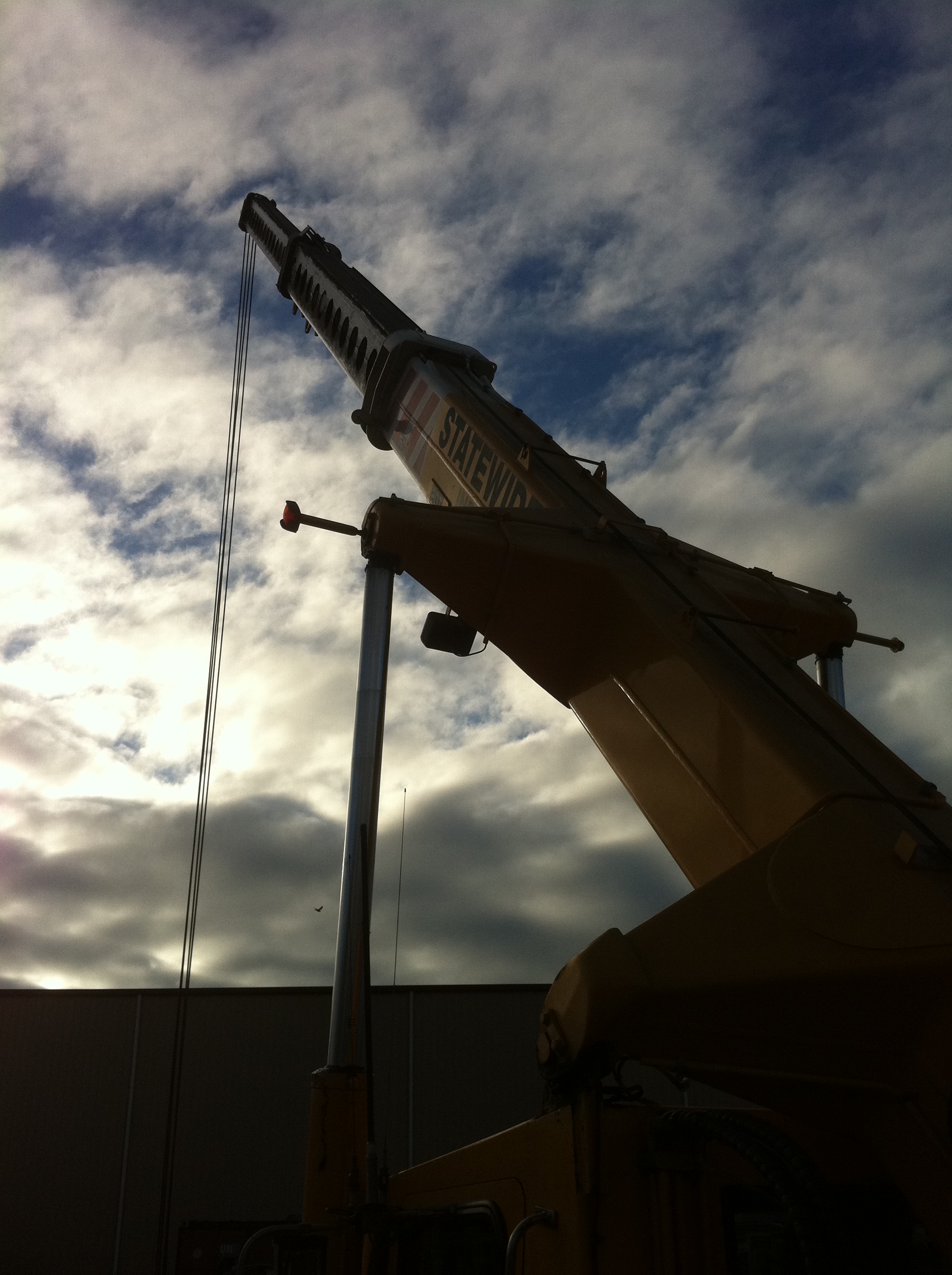 10) “Mullen Rigging had it’s 10 Ton capacity rooftop crane mounted to a custom designed “cart” that enabled it to move around the roof on the window washing track at the Bow Tower, downtown Calgary, Alberta. The crane hoisted structural steel, glass and other construction materials to the roof or other floors from an elevation of 790′ over the streets of Calgary.”
