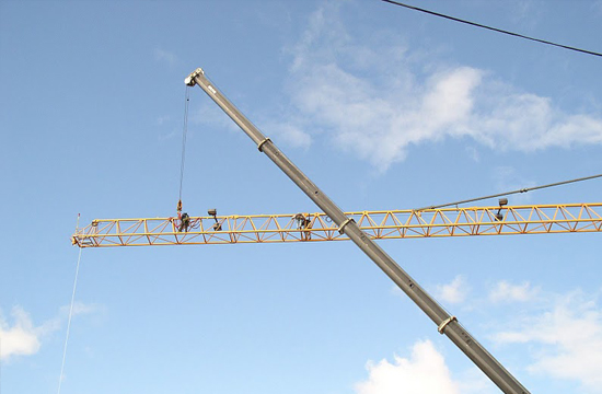 The installation of the Outer Section of the Jib is installed with the installation of three pins. Finally the Ballast (up to 60,000 lbs) is installed on the Counter Jib and the structural erection of the tower crane is complete. In most cases this end of the first day.