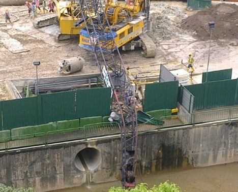 The lattice boom of a foundation crane went over the back of the crane in an accident in Singapore today. Fortunately no one was hurt in the incident which occurred on a site near the Ten Mile Junction station in Bukit Panjang, North central Singapore. The boom of the Weserhütte crane appears to have flipped over backwards after the equipment it was using broke free, causing a sudden unloading of the boom. The boom fell across the rear end of a Bauer piling crane working behind it, with the boom nose ending up in a canal. That’s all we have.