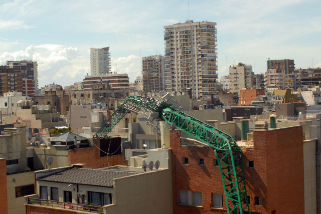 Buenos Aires, Argentina (Palermo Las Canitas) A tower crane on a specially designed pedestal collapsed killing no one. It fell over four buildings, destroyed the ceiling of one apartment, which would have likely killed the occupants if they were in that spot, but everyone walks away from this one.
