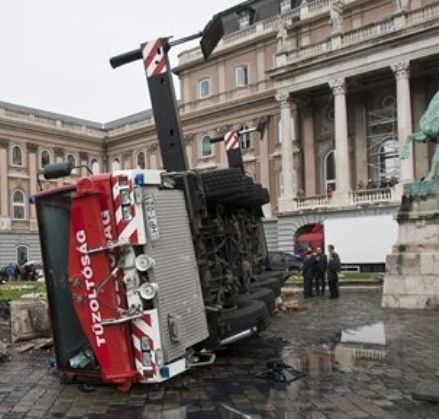 An All Terrain crane owned and operated by the Budapest Fire department turned over on Wednesday while lifting artwork into Buda castle. The crane a four axle Tadano Faun ATF 60-4, working over the rear, had just lifted a crate of Munkácsy paintings in to the castle by way of its large balcony. One front outrigger beam, the least beneficial one for the lift, was fully extended, while the rear one on the same side was partially extended. The two outrigger beams on the opposite side were set up fully retracted in order to avoid damaging the grass. Thankfully the paintings, the Christ Trilogy by Mihály Munkácsy had already been removed from the crate. It is thought that wind caught the crate as it was removed from the balcony, and when combined with the amount of boom extended created enough of a side load to pull the crane over onto its side. The boom nose came to rest in the middle of a parked car. Once again luck played a part in that the car was unoccupied.