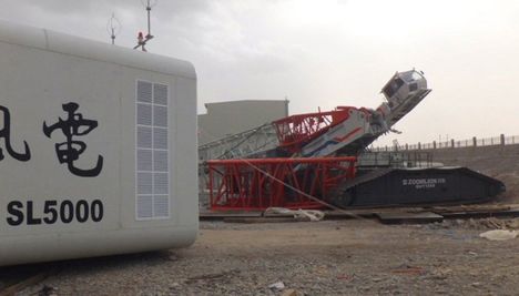 The crane a Zoomlion QUY 1000 crawler crane owned by Ningxia Tianxin Construction and development was lifting a 5MW wind turbine nacelle at the production facility of Sinovel where it was made. The load was recorded as 318 tonnes which was within the cranes capacity.