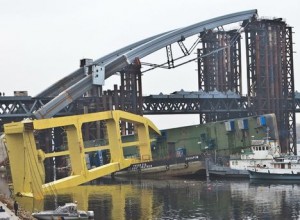 The crane has been working on the bridge for some time, we do not have any details of what caused it to overturn, although it looks as though at least one of its two floating stability barges broke away, significantly reducing its lateral stability.