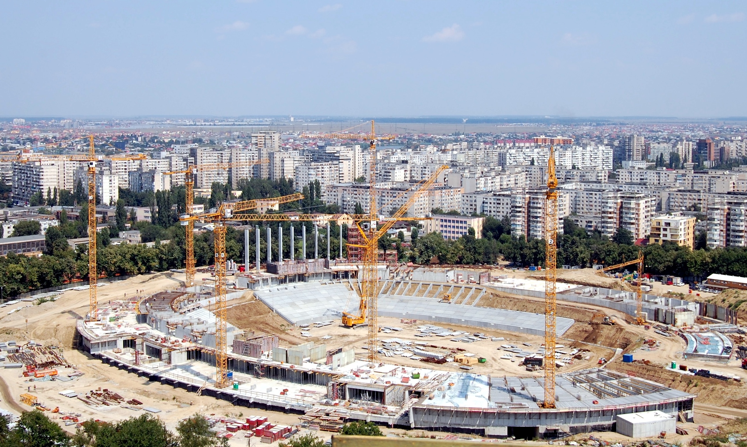 Seven Liebherr construction cranes are hard at work building the new Lia Manoliu National Stadium in Bucharest, capital of Romania. The free-standing assembled top-slewing cranes are helping to ensure that the project goes smoothly by handling a total of about 9,000 tonnes of steel, 75,000 m³ of cast-in-place concrete, and 25,000 m³ of prefabricated components.