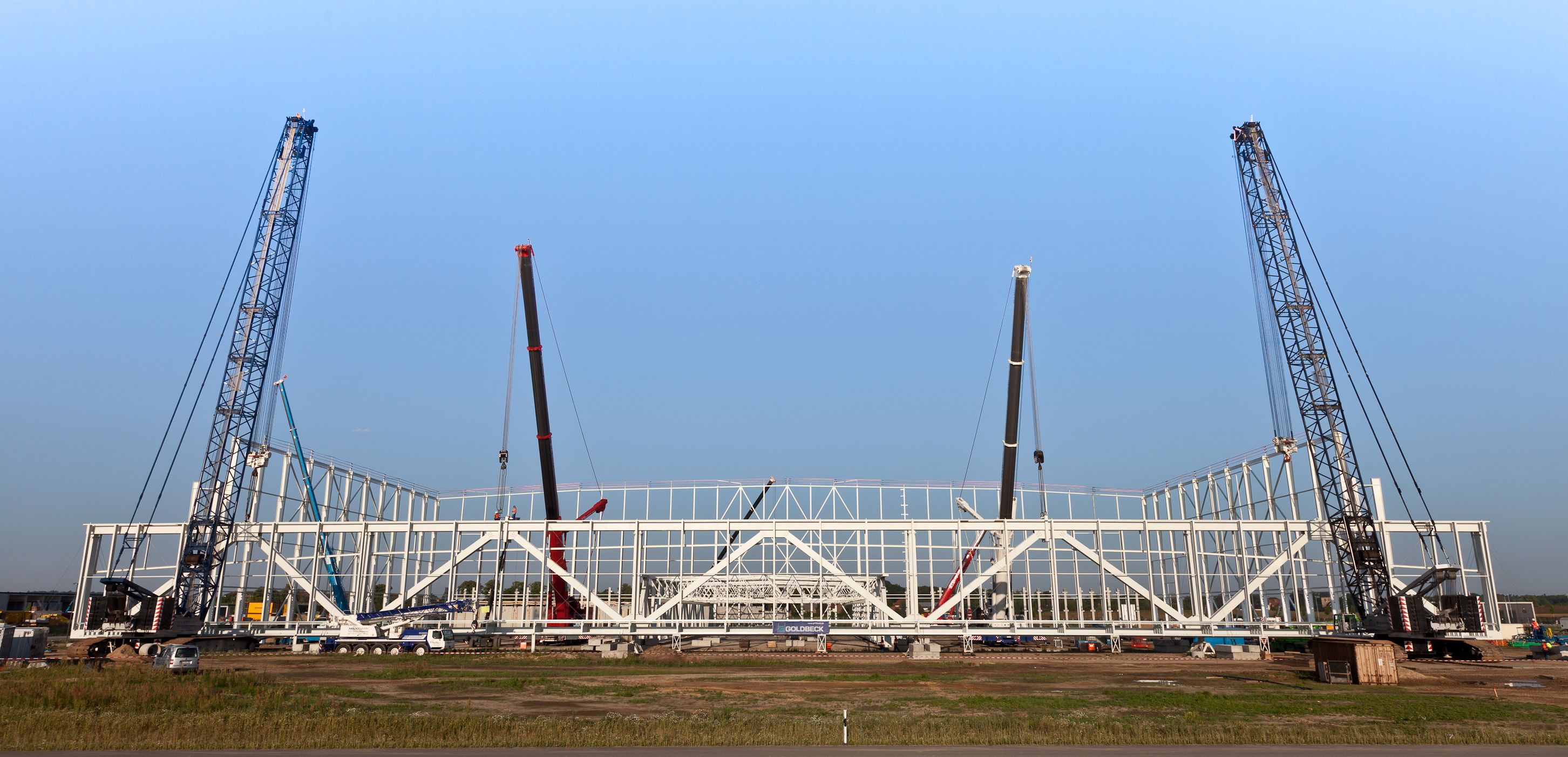 The door truss was first lifted and stabilized by the two CC 2800-1 units (working as the operation’s primary crane tandem team) with the help of another two 500-tonne telescopic cranes, after which it was moved 15 meters to its final horizontal position. Once there, the truss was brought to an installation height of 30 meters between the outer walls, where it was anchored. Terex also played an important role during this process, as several Genie® aerial work platforms were used in order to bring the necessary construction personnel up to the dizzying heights required for this work to be carried out. Once this was done, the two 500-tonne units increased their hook load to 100 tonnes so that the two Terex CC 2800-1 cranes would be able to unhook from the load and lift the roof truss central section segment together with two 300-tonne cranes. Once the central section segment was picked up, it was moved onto the door truss (still being held by the two 500-tonne cranes) so that it could be joined to the hangar’s rear wall, thus completing the second multi-crane erection operation.