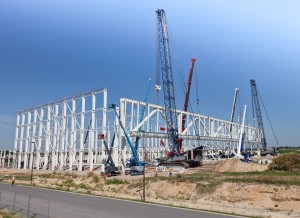 Two Terex® CC 2800-1 lattice boom crawler cranes worked in tandem to help erect the steel frame for the maintenance hangar at the Berlin-Brandenburg International (BBI) airport construction site. More specifically, MAXIkraft Kran- und Schwerlastlogistik lifted the door truss and the roof truss central section segment on behalf of Industriemontagen (IMO) Leipzig GmbH on July 6th, 2011. Due to the large components involved, an erection team consisting of multiple cranes performed the double lift operation.
