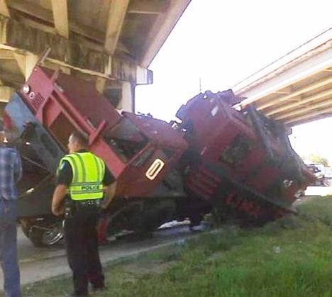 The incident occurred under a highway overpass when the crane’s superstructure seems to have slewed over the side of the truck causing it to lose stability. The crane appears to be an old Lima lattice truck crane and if so must be somewhere around 30 years old – if not more.