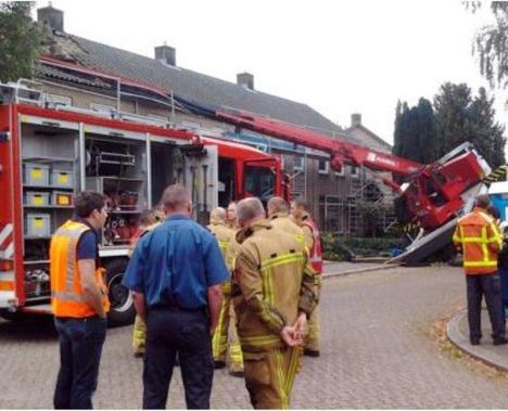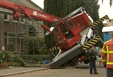 A large loader crane overturned in Heerde, the Netherlands today after one of its outrigger beams snapped. The boom came down onto the roof of a house killing one of the men working on the roof.