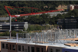 Radio-controlled Potain cranes are lifting 653 structural metal stud and interior load bearing panels onto a seven-story structure and saving a week and a half of construction time per floor
