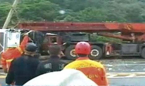 A runaway crane smashed into a bus yesterday in Taiwan killing four people – three women and a man – and injuring a further eight. There were a total of 16 passengers on the bus. The accident involving a dated four axle truck crane, occurred in Guishan, Taoyuan County. The cause has been blamed on a brake failure, the crane hit the bus flipping it onto its side and, according to local reports pushed it for 120 metres before it came to a halt. Other reports also suggest that the crane did not have a road permit, the crane driver survived the accident.