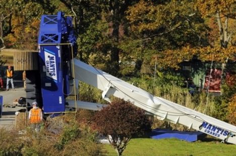 A telescopic crawler crane has tipped over this morning in Connecticut while installing its counterweights. The crane a brand new Mantis/Tadano -either a 77 or 100 ton capacity unit, was setting up by the side of the road in Niantic, East Lyme and appears to have been lifting one of its slabs of its counterweight prior to installing it when it went over. A second section of counterweight is just visible behind the crane and it does not look as though the undercarriage was extended to its full width. The crane’s boom has hit the ground with such an impact that it has buckled the base section. We understand that no one was hurt in the accident. The crane which is apparently owned by Rhode Island contractor Cardi, was due to go to work on an Amtrak railway project.