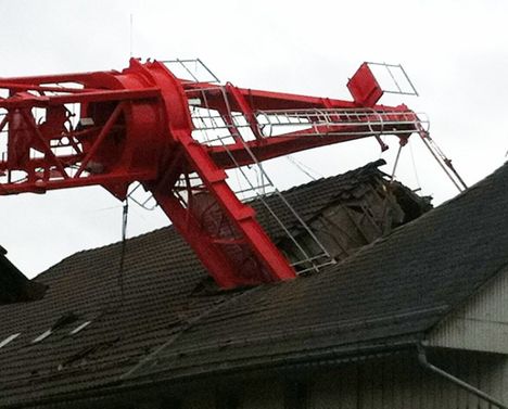 A 45 metre free standing tower crane went over in Studen in the Canton of Bern in Switzerland last week, injuring three. The crane, a fairly recent WolffKran owned by the Thun based contractor Frutiger, was mounted on a cross base which was sitting on built-up ground, retained by pilings. The ground was totally saturated from heavy rain and it seems that one leg of the cross base sank into the ground causing the crane tip over and twist, throwing the concrete counterweights to the ground. The back mast and tower landed on the Linde Restaurant and a car body shop. The operators cab broke free from the crane when the back mast pierced the restaurant roof and suddenly stopped the towers fall, it then crashed through the roof of a car port which helped to cushion the fall. The operator was taken to hospital with a broken shoulder.