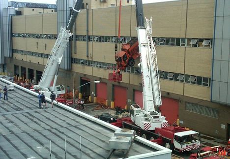 Bay City Cranes was called in to make the vehicle safe and then remove it, the company employed two mobile telescopic cranes one to lift the truck back into the building – the safest way of extracating the vehicle – and one to support a suspended platform from which the rigging crew could work.