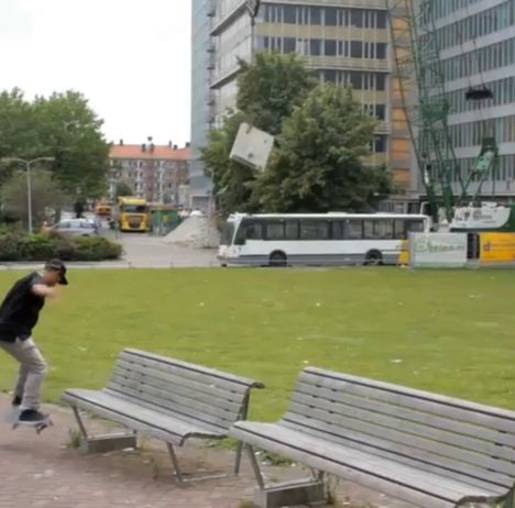 The story goes that some young skateboarders were filming each other in an Amsterdam park when the incident occurred behind them.