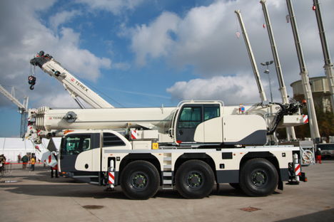 Terex has unveiled a three axle 50 to 60 tonne All Terrain crane on three axles at its open day in Zweibrücken. dubbed the Challenger 3160, it is a light weight 50 to 60 tonne crane with 50 metres of main boom. It will lift over 35 tonnes to four metres radius and yet can meet 10 tonne axle loads if its counterweight is removed. Fully rigged it it meets 12 tonne axle loadings. The 2.55 metre wide chassis features all wheel steering and the company’s new cabs that were unveiled at this year’s Bauma. The new crane will appeal to markets where a lighter more roadable crane with long boom is appreciated fro taxi crane work. The Challenger is the second crane that the company has chosen to give a name to, following the launch of the 100 tonne Roadmaster 8000, announced in September. It will be the first of a new family of All Terrain cranes that follow a similar principle. The nomenclature used on this model represents the number of axles and the crane’s capacity in tonne/metres so three axles 160 tonne metres.