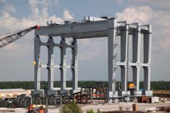 Under the Army Corps of Engineers project, the rail-mounted gantry will be used to lift and carry pre-cast concrete shells as part of the Olmsted Locks and Dam Navigation project. The gantry will be able to move the lifting frames, in which the concrete shells are placed, perpendicular to the rails.