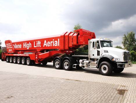 The Ruthmann Steiger TTS1000 sold by German rental company Gerken to Abilene High Lift of Texas, has now been shipped after a refit/refurbishment at the Ruthmann service centre in Gescher-Hochmoor, Germany. The refit also included matching the trailer mounted lift with its new American Mack tractor unit and finally signwriting with the Abilene name. While there are now several models with a 100 plus metre working height, the Ruthmann, mounted on a six axle trailer with a three axle tractor, has the most outreach for this size of lift at 40 metres at heights of up to 60 metres. The unit includes Ruthmann’s remote information and diagnostic system which is programmed to work in the USA, allowing technicians in Germany to log in remotely to the control system if asked, in order to resolve technical or application problems.