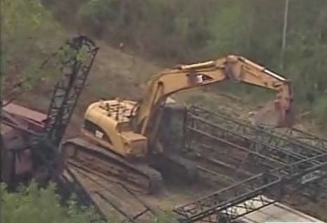 A man was seriously injured last week in Choctaw, Oklahoma after a boom section landed on him. The accident happened on a bridge repair project when a lattice crane boom section fell on him. The section was being lifted by a 360 degree tracked excavator when it slipped, struck the man on the head and then pinned him to the ground. The section was quickly lifted off of him and he was airlifted to hospital by helicopter. We do not have any news of his condition. The principal contractor on the site is Sewell Brothers of Oklahoma, there were a number of crawler cranes of considerable vintage on site at the time in addition to the crane being rigged/stripped out.