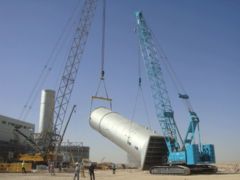 Over two days in June MAG Engineering & Contracting in Jordan conducted two heavy lifts of 52 tonne stacks on the Qatrana Power Plant Project. The lifts were normal other than the congested site conditions and the height of the final location for the lift. It was the height that called for the services of the biggest crane in Jordan – a Gottwald MK500. “The tilt-up process was the easy part of the job because we had a 500 tonne capacity Gottwald MK500 as the main crane, rigged with 63 m of main boom and capable of lifting 103 tonnes at the 22 m radius where the stack is scheduled for erection. The tailing crane was a Kobelco CKE1350 rigged with 33.5 m of main boom and capable of lifting 75 tonnes at 11 m radius,” Mousa explains.
