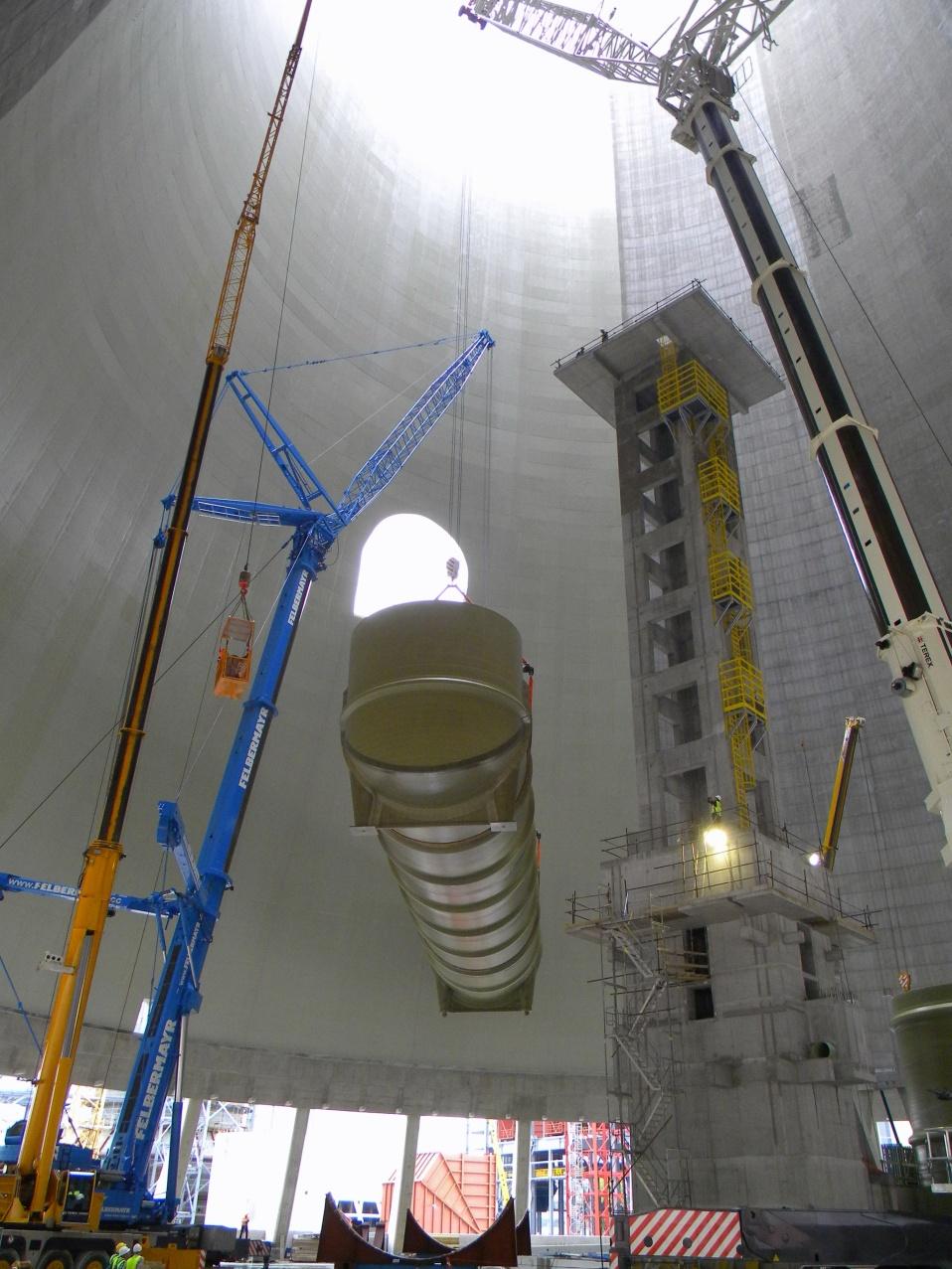 On September 26th, the Felbermayr team was ready to perform the two lifts, a tandem lift and a single lift. The team performed the tandem lift first: A 40 meter-long plastic pipe with a diameter of about eight meters and a weight of approximately 37 tonnes (including rigging gear) had to be lifted to a height of 64.5 meters over a protruding edge of a height of 56 meters. Working at a radius of 28.6 meters, the AC 1000 picked up the load in tandem with the 500 t Liebherr assist crane. During the lift, the radius was reduced to 23 meters and the pipe was rotated 45° at a hook height of 64.5 meters, then it was set down on a concrete pipe at the center of the cooling tower.