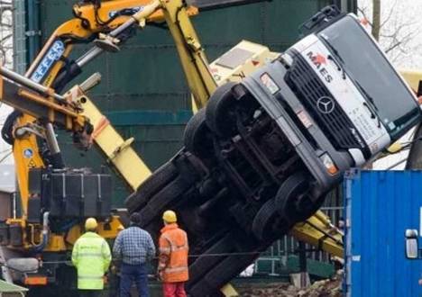 A 70 metre truck mount tipped over in the North of Holland yesterday after one of its jacks punched through a concrete yard. The lift, owned by Belgian rental company Maes, was working in a farm yard installing a mobile phone antenna to the top of a silo. In order to reach a specific point the lift was repositioned, set up and the boom extended when one of the outrigger jacks punched through an old concrete base into the soft ground below.