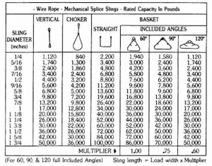 Solution #1: Since we want to rig the load at a 90 degree angle or less, we can look in the 90 degree column on the rated capacity card and find what size of wire rope meets or exceeds 12,000 lbs. We find that the sling legs will need to be made of at least ¾” wire rope.