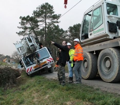 The crane was working on the LGV high speed train line currently being built between Bordeaux and Tours and made a wrong turn as it exited the site and headed down the road that is officially barred to site traffic.