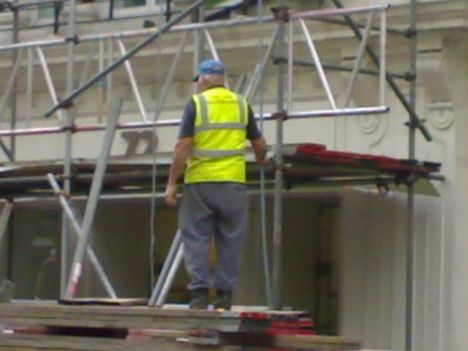 A reader in the UK spotted a scaffold team erecting a tube a coupler façade scaffold on Sunday and felt it qualified for our Death Wish series. The scaffold was being erected by a scaffold company called Red Lion, next to the Canon Street railway station near St Pauls in the City of London. Our corresponded says: “One man was wearing a harness but was not using it the other on the scaffold had no harness or hard hat. The third man stood on the truck pulling on the gin rope had no harness and no head protection should anything fall from the work going on above. With all the talk of work at height regulations, the efforts of industry associations to improve safety with programmes such as Through The Trap tower erection, and of manufacturers with their advance guardrail systems for towers, we have scaffolding such as this being erected in the capital city of the country that preaches safety more than any other, in a manner which clearly ignores basic rules. One wonders how tube and coupler scaffold can still compete with system scaffold, given the cost of skilled labour these days. That aside it is interesting to note that all three men have their HI-Viz vests on yet don’t bother with harnesses or hard hats which are likely to contribute a great deal more to their safety that a brightly coloured jacket. The man on the truck in particular, standing on a stack of scaffold planks as he operates the hoist, makes a mockery of the HSE’s efforts to enforce risk assessments for working at any height. It is also hard to square this with the efforts that some companies make to meet the Work At Height Rules, such as crane hirers which fit guardrails and steps to their relatively low trailers such as those designed to carry counterweights. One positive thing is that the scaffold poles and in particular the planks all look to be in good condition and relatively new – not so sure about the couplers – although to be fair the photographs are not good enough to comment.