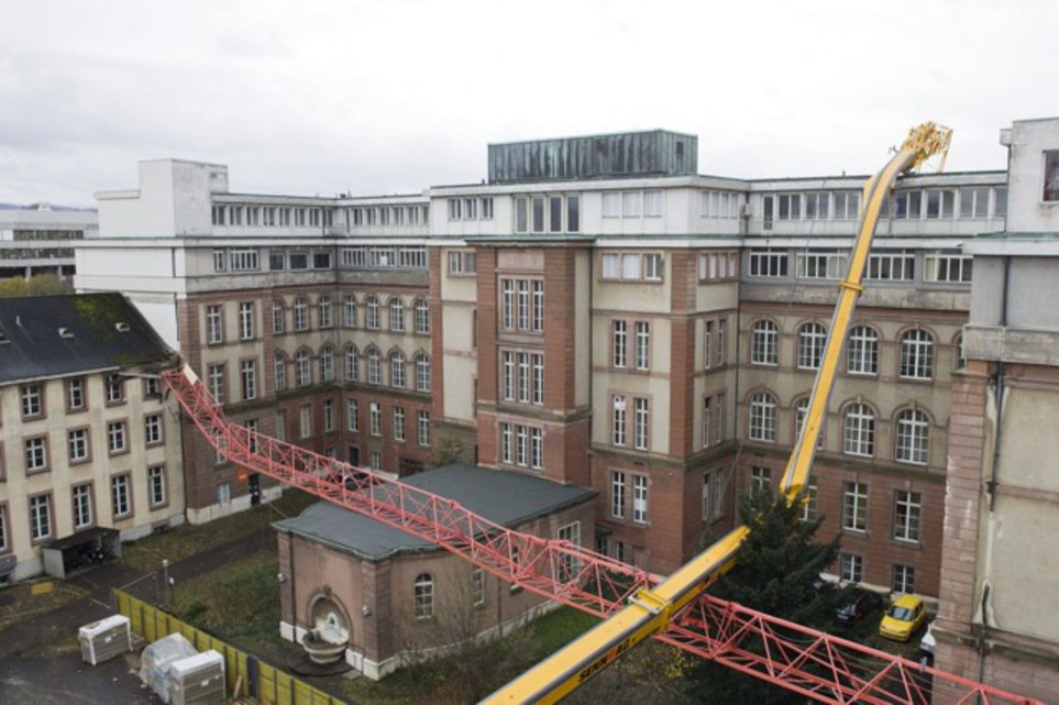Blick vom Dach des im Bau befindlichen Kinderspitals auf den umgestürzten Pneuladekran, dessen Ausleger auf das Dach eines Spital-Altbaus des ehemaligen Frauenspitals aufschlug. Im Vordergrund quer der demontierte rote Ausleger des Baustellenkrans. Kranunfall. © Henry Muchenberger