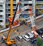 Tokyo, Japan a Luffing Tower Crane being climbed down for dismantle appears to have suffered a hydraulic failure in the climber that caused the boom to collapse killing a worker and person on the ground.