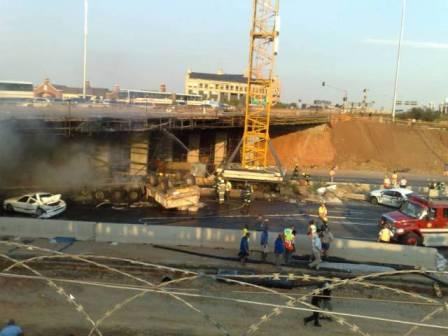 Pretoria, South Africa A truck travelling down the N1 highway lost control slamming into four cars and a tower crane that was erected in what appears to be the median between the two directions. It was assisting in the building of a bridge. One report says that the crane was moved over a meter with the supports damaged. Looking at the picture the crane is clearly out of plumb but still standing which is a testament to the cruciform base design that it is sitting on.