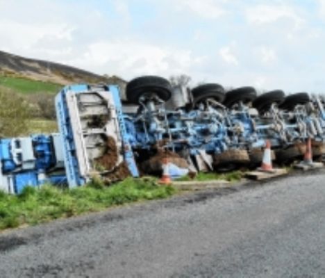 The latest casualty of wind those farm roads that are unsuited for cranes or big aerial lifts is a 103 metre WT1000 truck mounted aerial lift which rolled at the Gordonbush wind farm in Scotland.