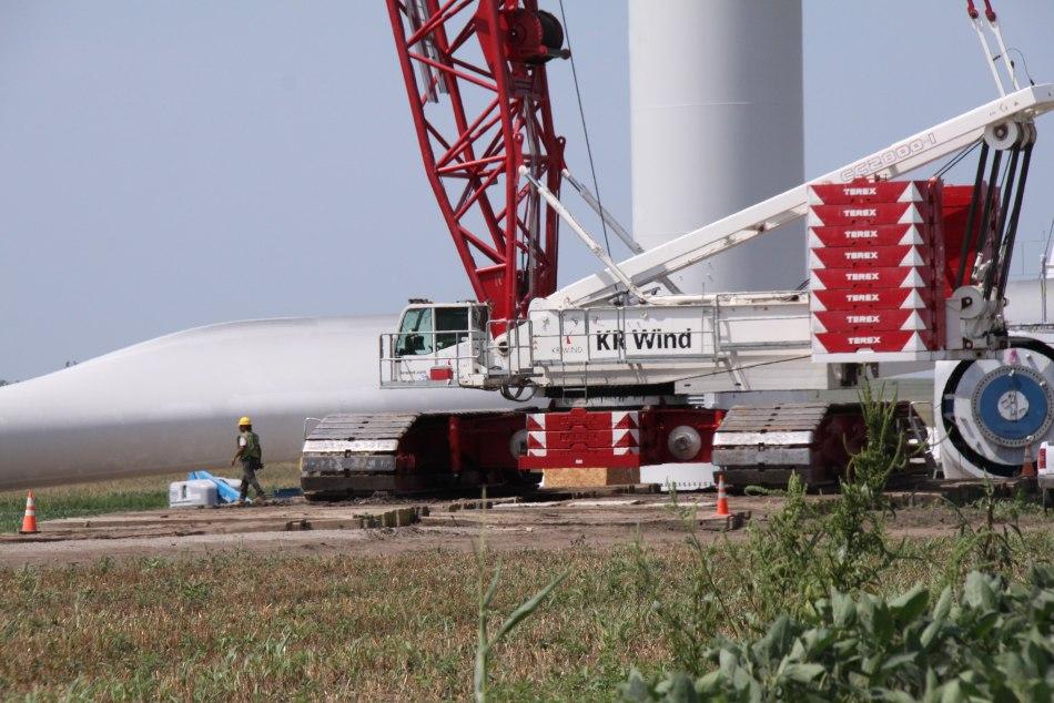The nimble Terex CC2800-1 crawler crane led the construction charge, which began in early July, by erecting the first three tower segments. These heavier base sections ranged in weight between 79.6 and 81.7 ton (72.2 and 74.1 t). After completing installation of these three base tower segments, the crawler crane was moved the 0.25 to 1 mi (0.4 to 1.6 km) to begin construction of the next tower base.