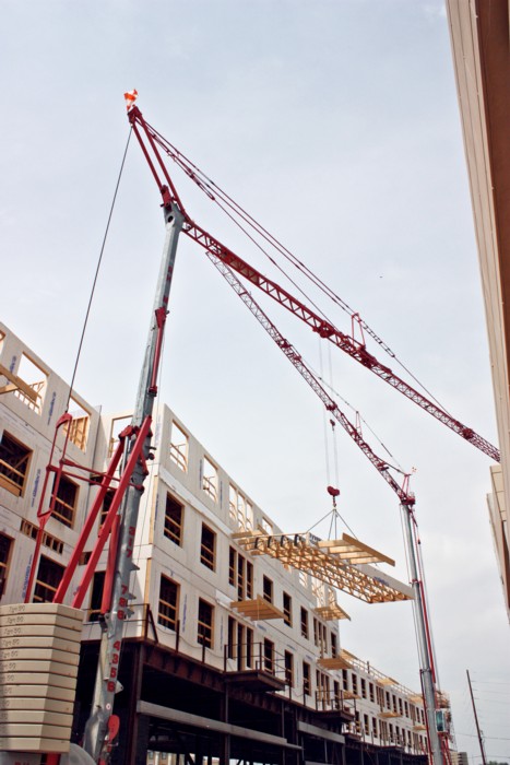 Two Potain HDT 80 self-erecting cranes are helping build an apartment complex in downtown Indianapolis, Ind. The contractor, Larry R Wagler Construction, chose the cranes for their easy assembly and ability to operate in limited space. Larry Wagler, owner of the company, has used self-erecting cranes since 2006 and finds Potain self-erecting cranes indispensible for the type of framing work his company does, which is primarily building commercial properties in crowded urban areas. “The Potain self-erecting cranes are great for compact jobsites. The cranes take very little room to set up,” said Wagler. “They’re also quick to erect.” On this job, the cranes are setting walls and trusses for an apartment complex called The Avenue.